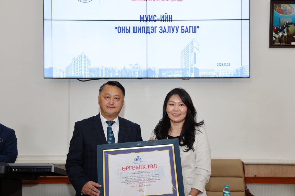 On October 3, 2025, in celebration of the 31st World Teachers’ Day and the 59th Teachers’ Day of Mongolia, three distinguished faculty members of the Business School were honored with the National University Annual Best Faculty Awards.
