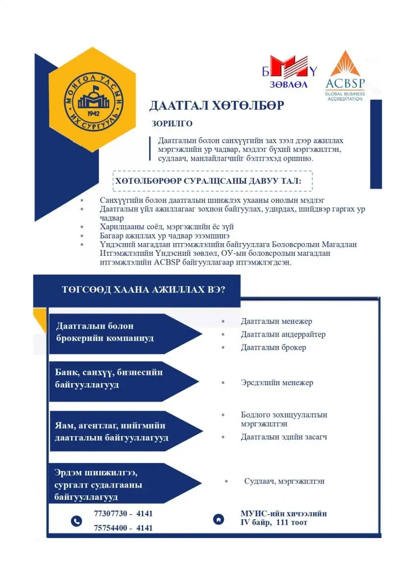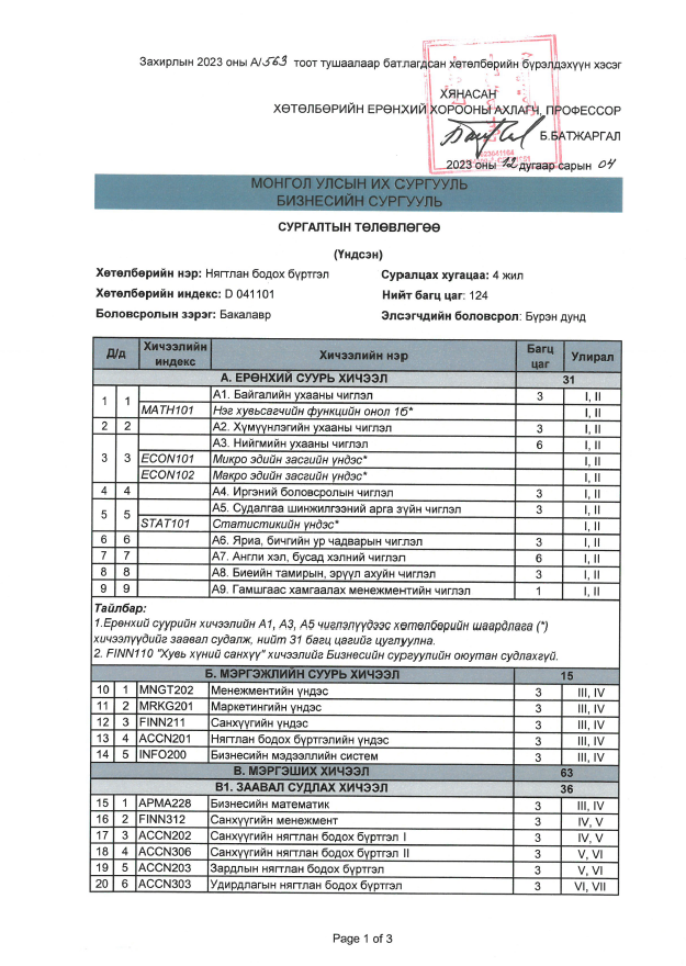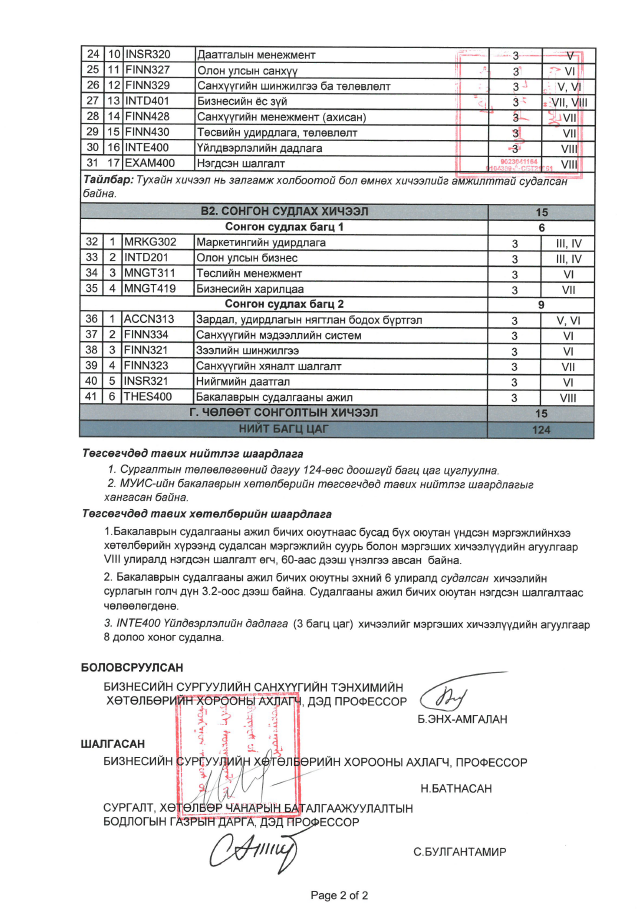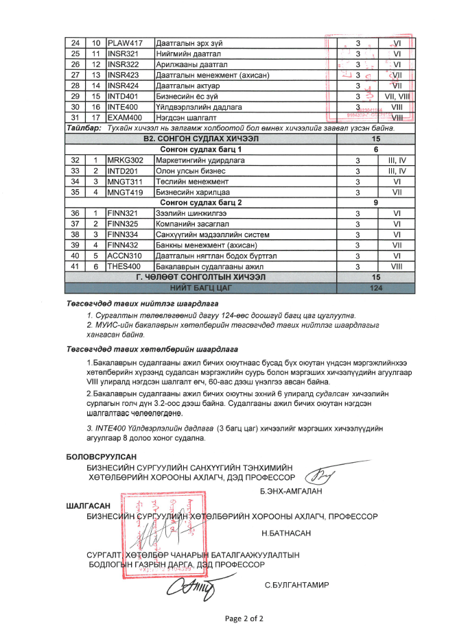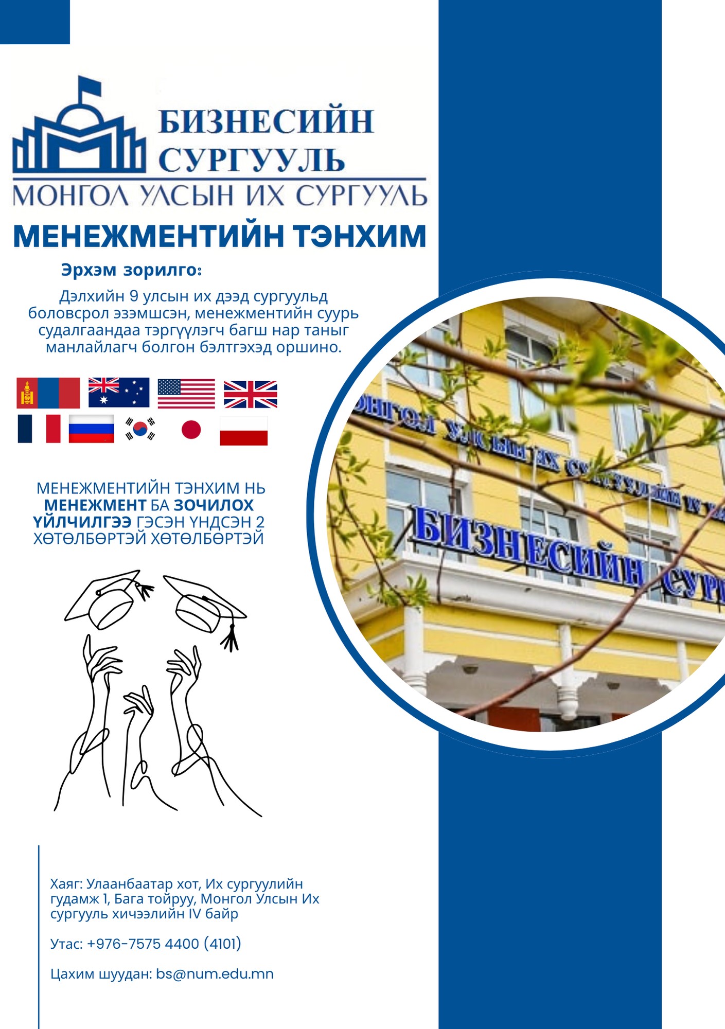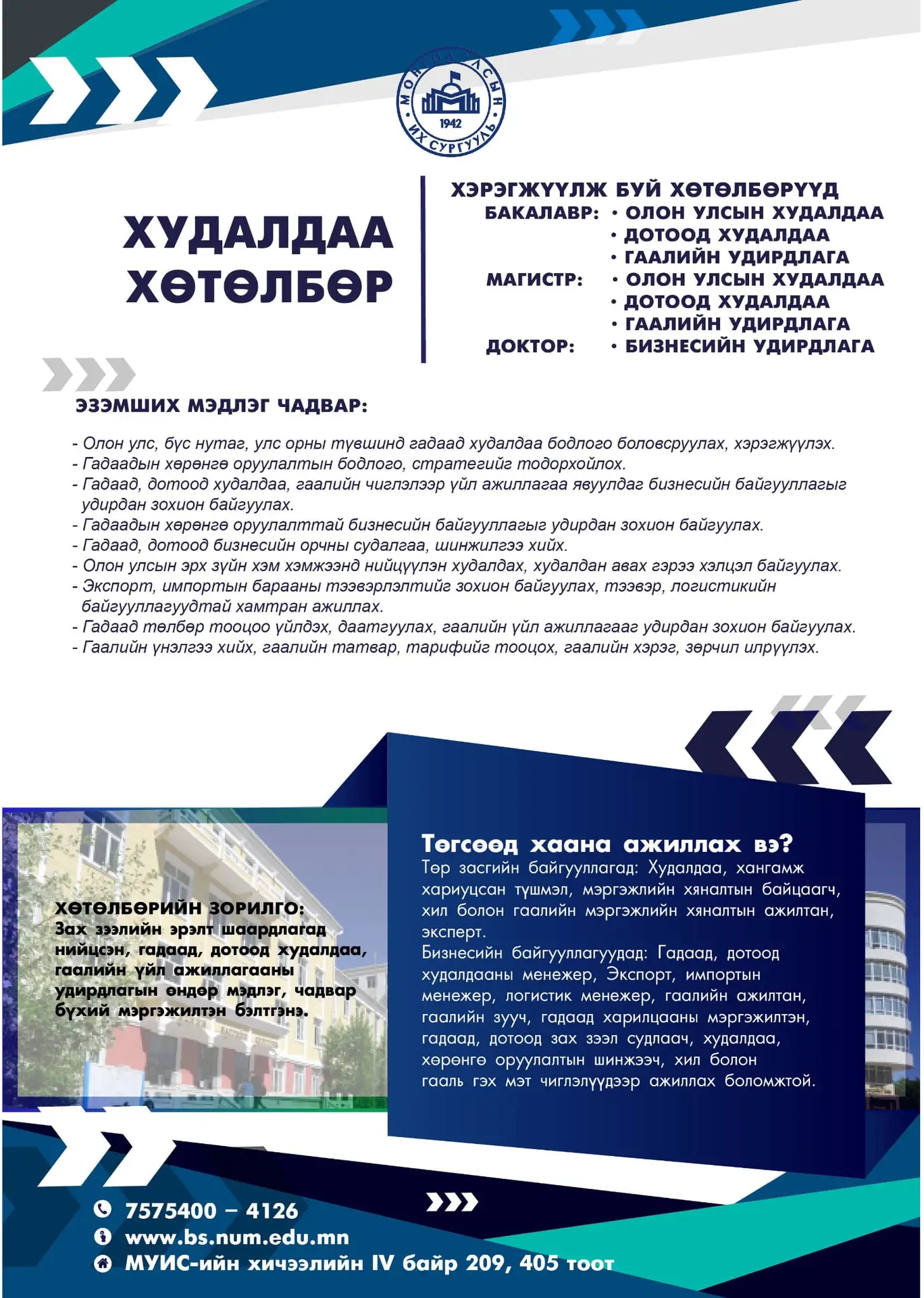 In connection with the updated curriculum and regulations of the National University of Mongolia, students enrolled in the School of Business will study in the following bachelor’s programs: