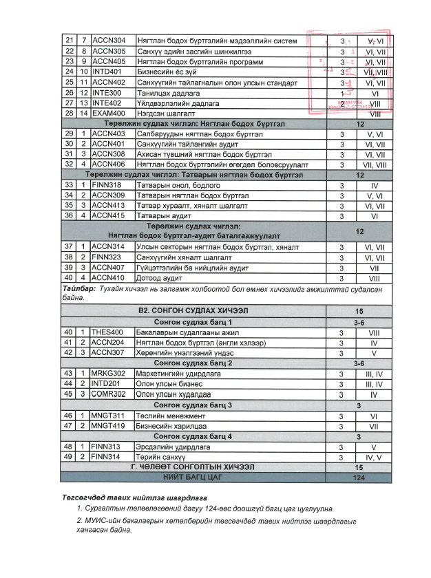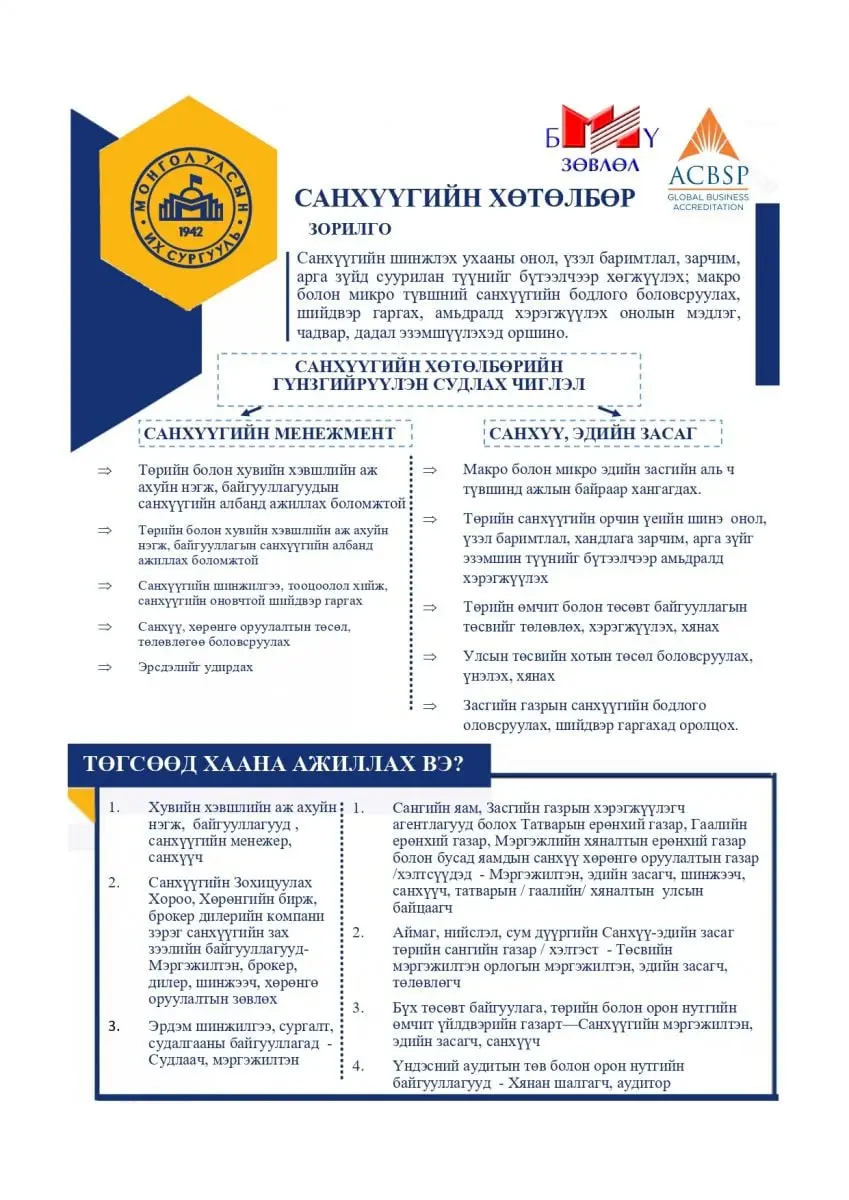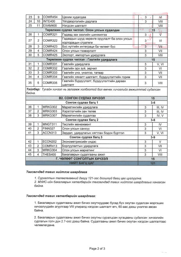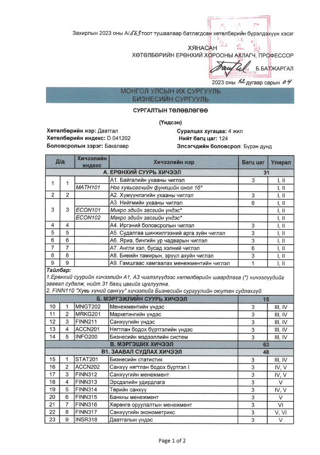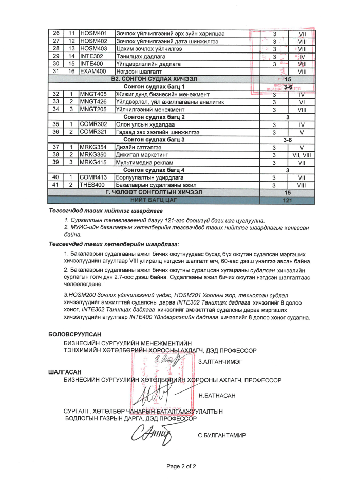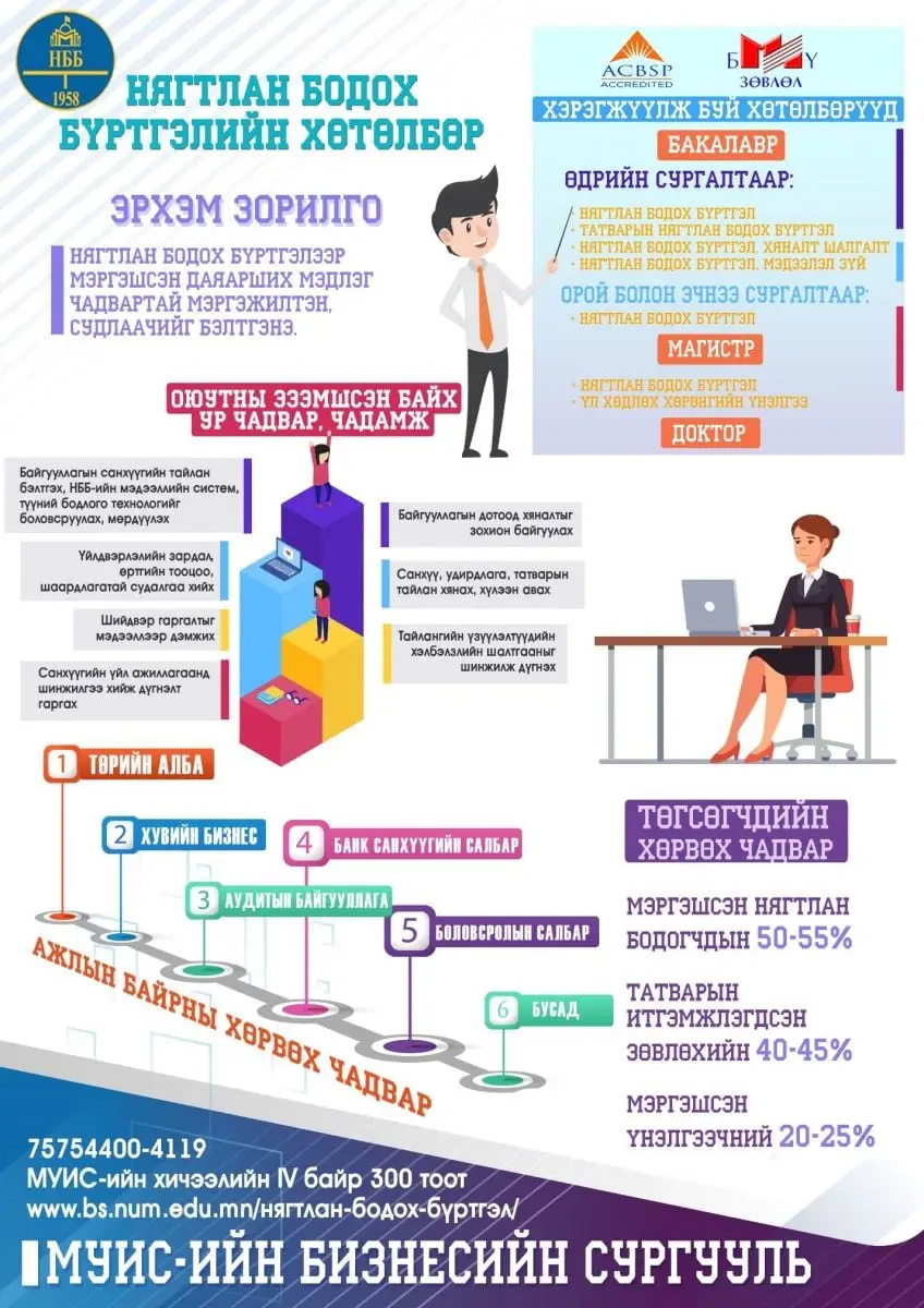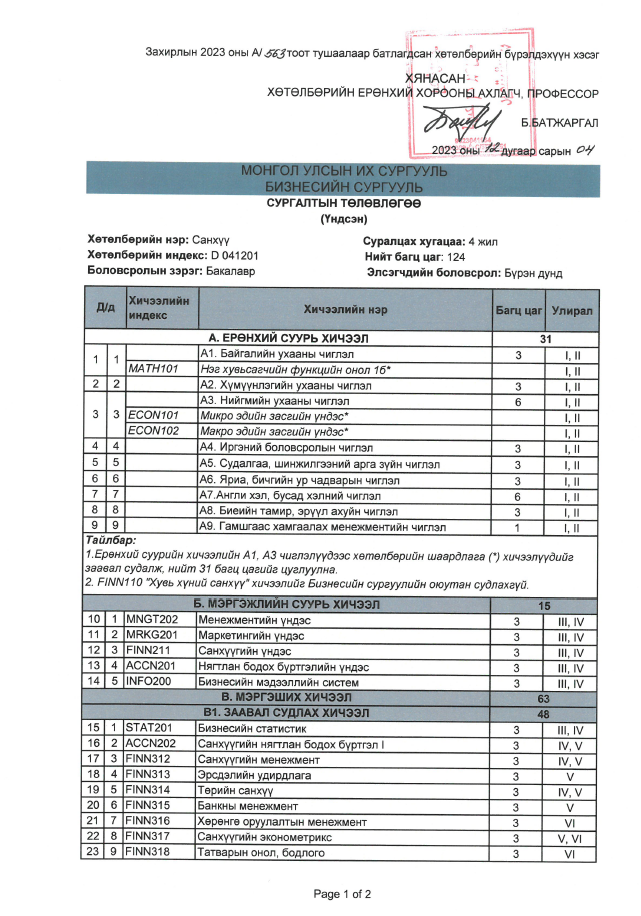 In connection with the updated curriculum and regulations of the National University of Mongolia, students enrolled in the School of Business will study in the following bachelor’s programs: