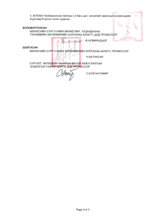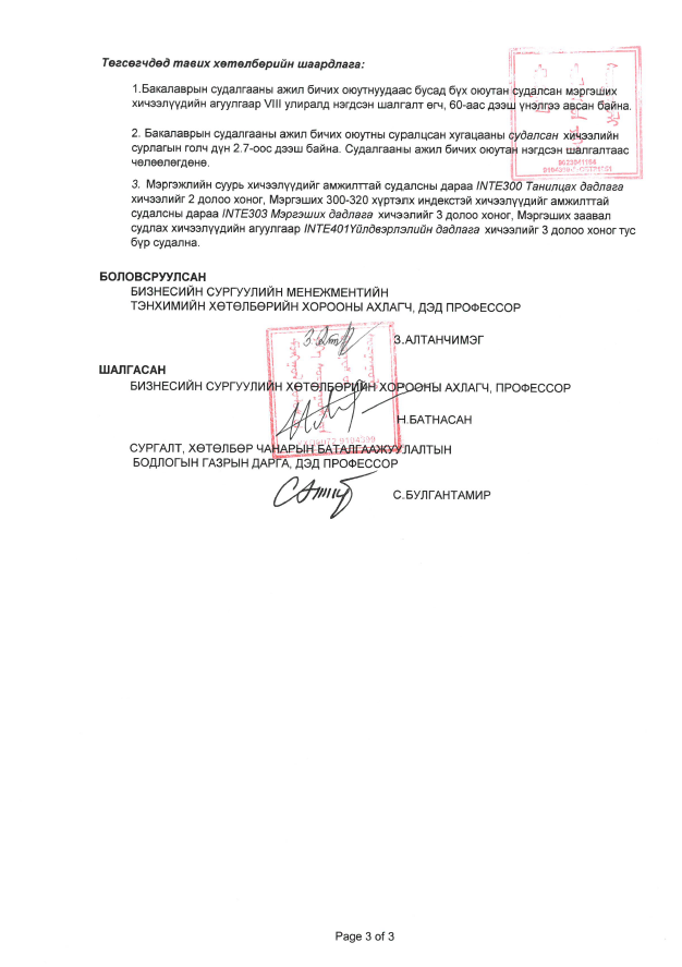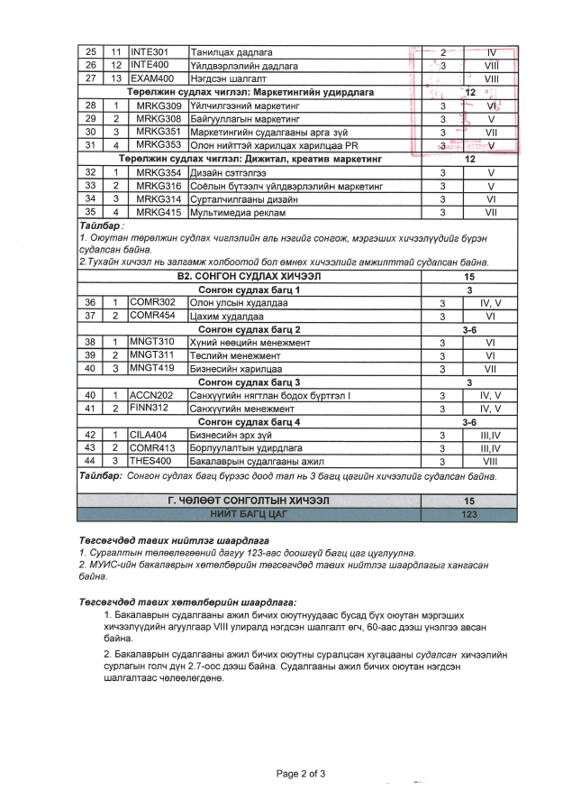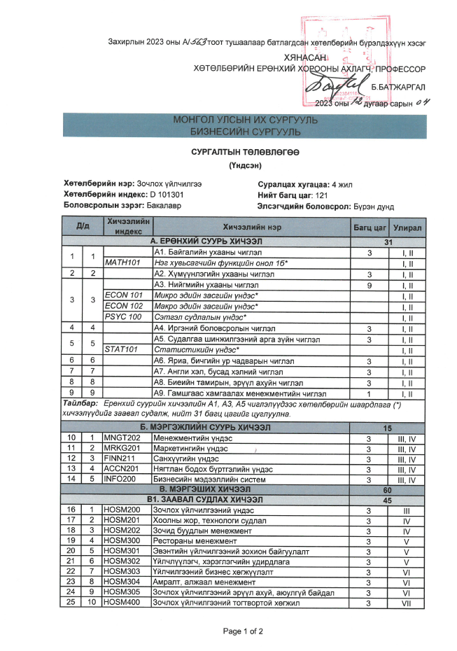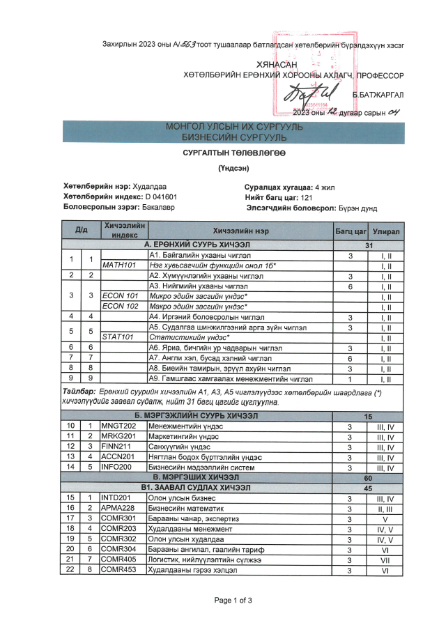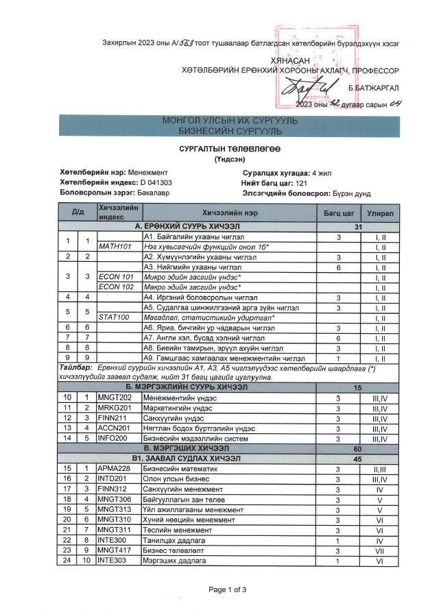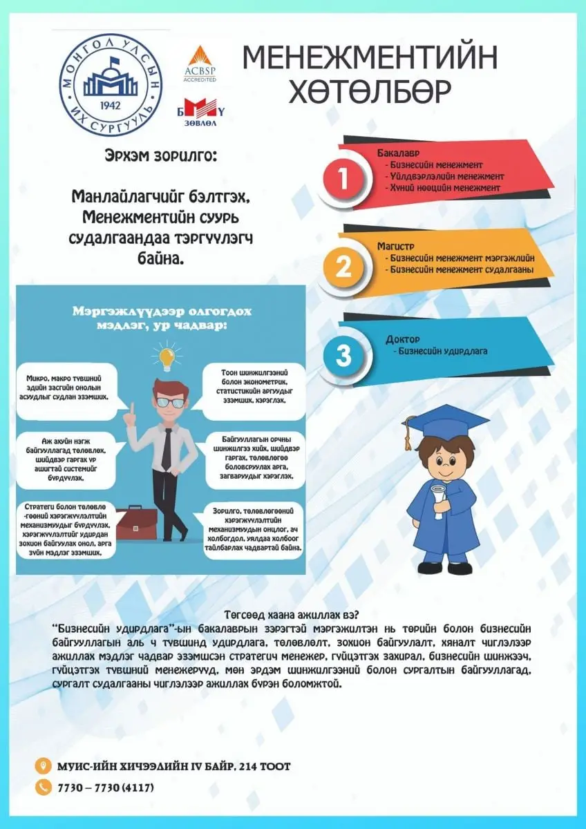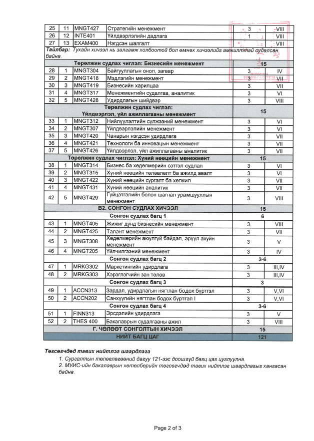 In connection with the updated curriculum and regulations of the National University of Mongolia, students enrolled in the School of Business will study in the following bachelor’s programs: